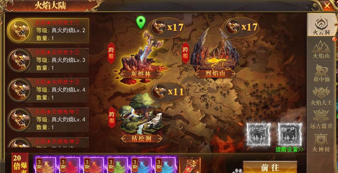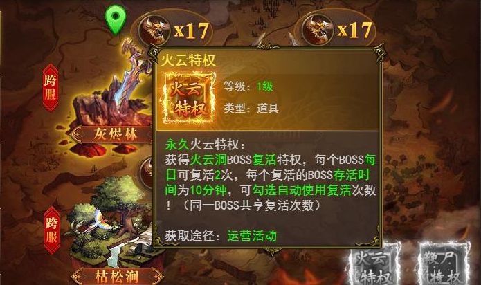 火云特权:获得火云洞BOSS复活特权,每个BOSS每日可以复活两次,可以自动使用复活次数。