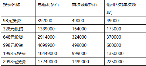 注: 购买投资后,将会获得投资宝箱,每次打开宝箱领取钻石返利,需间隔3天时间。
