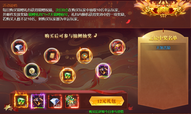 活动内容:活动期间内,每日购买锦鲤礼包可获得锦鲤祝福,次日0点购在购买玩家中随机抽取10名幸运玩家,并邮件发放奖励:锦鲤礼包+7天锦鲤称号。