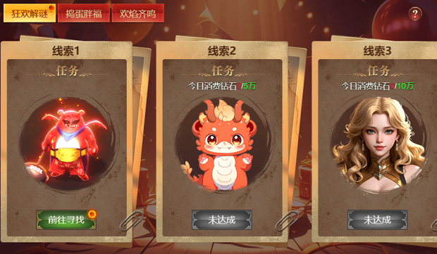 活动内容:活动期间内,参与狂欢解谜、捣蛋胖福、欢焰齐鸣,可获得红包、钻石、庆典烟花等诸多福利奖励。