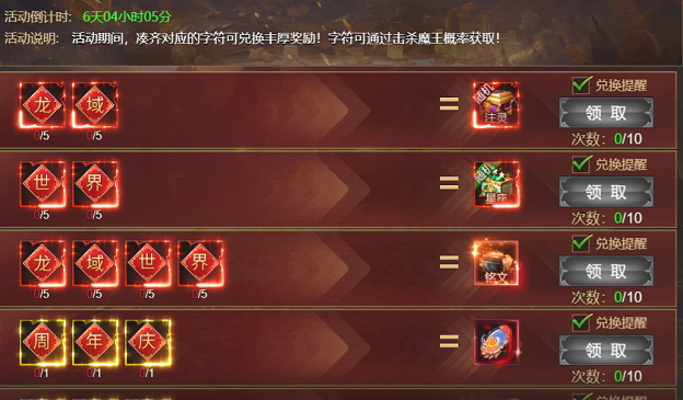 活动内容:活动条件:周年狂欢时段,野外魔王掉落大量字体!收集道具“龙”“域”“世”“界”“周”“年”“庆”,集齐不同组合的字样,可以兑换海量奖励,更有专属周年纪念限定称号。