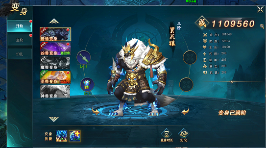 ⦁ 普通变身、凶兽变身、魔兽变身技能针对PVE,圣兽变身、神兽变身技能针对PVP,达到条件后玩家可消耗对应道具升级变身技;