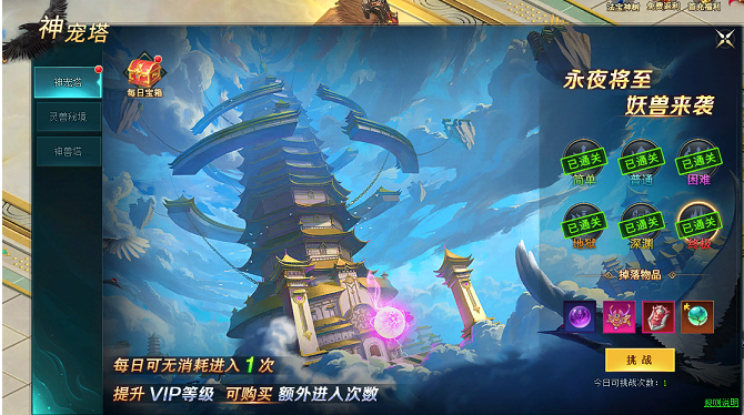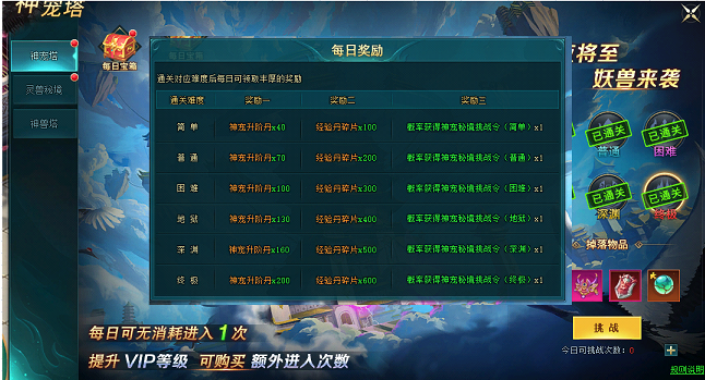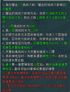 副本内所有怪物均有概率掉落神宠装备、灵兽塔挑战令、经验丹碎片